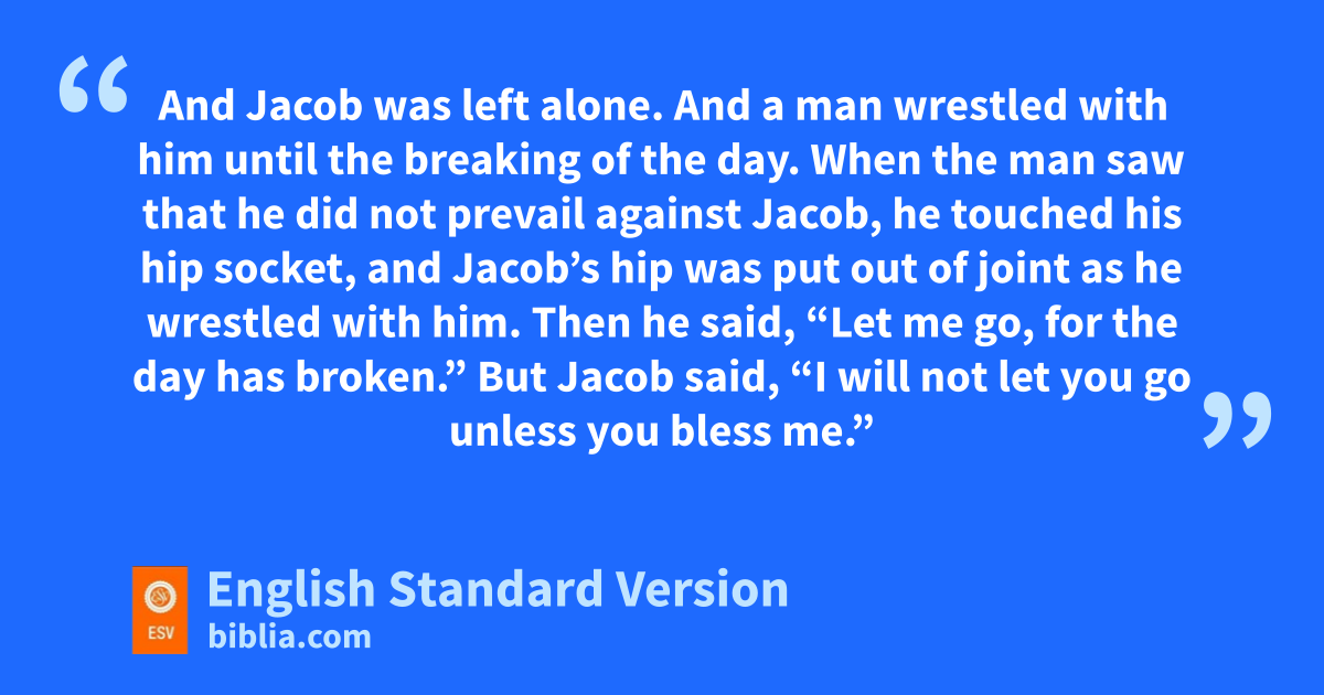 22 The same night he arose and took his two wives, his two female servants, and his eleven children,5 and crossed the ford of the fJabbok. 23 He took them and sent them across the stream, and everything else that he had. 24 And Jacob was left alone. And ga man wrestled with him until the breaking of the day. 25 When the man saw that he did not prevail against Jacob, he touched his hip socket, and Jacob’s hip was put out of joint as he wrestled with him. 26 Then he said, “Let me go, for the day has broken.” But Jacob said, h“I will not let you go unless you bless me.” 27 And he said to him, “What is your name?” And he said, “Jacob.” 28 Then he said, i“Your name shall no longer be called Jacob, but Israel,6 for jyou have striven with God and kwith men, and have prevailed.” 29 Then Jacob asked him, “Please tell me your name.” But he said, l“Why is it that you ask my name?” And there he blessed him. 30 So Jacob called the name of the place Peniel,7 saying, “For mI have seen God face to face, and yet my life has been delivered.” 31 The sun rose upon him as he passed nPenuel, limping because of his hip. 32 Therefore to this day the people of Israel do not eat the sinew of the thigh that is on the hip socket, because he touched the socket of Jacob’s hip on the sinew of the thigh.