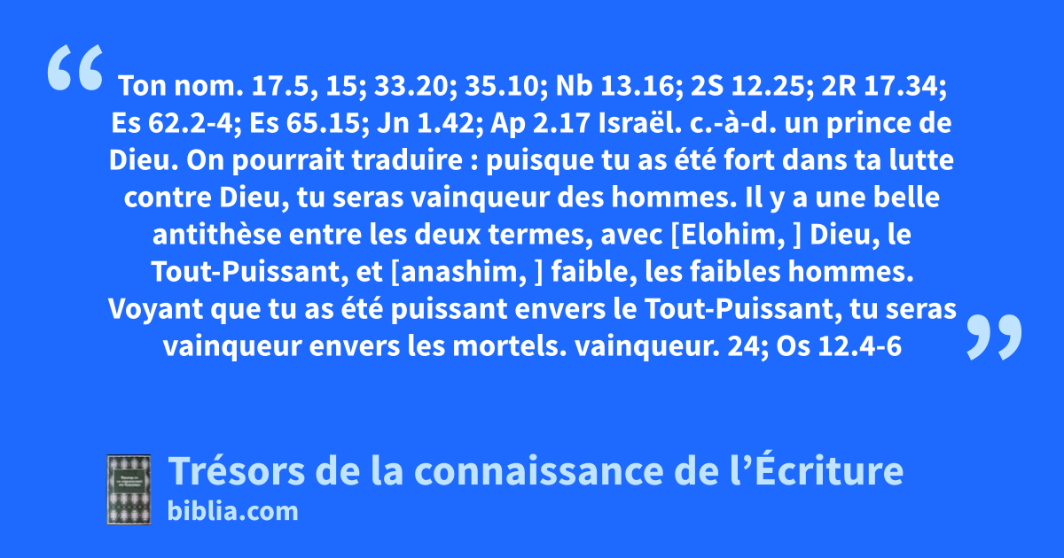 Ton nom. 17.5, 15; 33.20; 35.10; Nb 13.16; 2S 12.25; 2R 17.34; Es 62.2-4; Es 65.15; Jn 1.42; Ap 2.17 Israël. c.-à-d. un prince de Dieu. On pourrait traduire : puisque tu as été fort dans ta lutte contre Dieu, tu seras vainqueur des hommes. Il y a une belle antithèse entre les deux termes, avec [Elohim, ] Dieu, le Tout-Puissant, et [anashim, ] faible, les faibles hommes. Voyant que tu as été puissant envers le Tout-Puissant, tu seras vainqueur envers les mortels. vainqueur. 24; Os 12.4-6 avec des hommes. 25.31; 27.33-36; 31.24, 36-55; 33.4; 1S 26.25; Pr 16.7