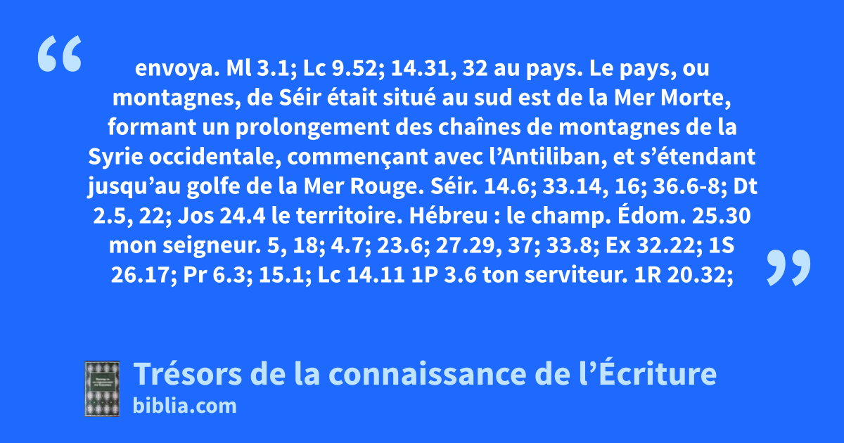 envoya. Ml 3.1; Lc 9.52; 14.31, 32 au pays. Le pays, ou montagnes, de Séir était situé au sud est de la Mer Morte, formant un prolongement des chaînes de montagnes de la Syrie occidentale, commençant avec l’Antiliban, et s’étendant jusqu’au golfe de la Mer Rouge. Séir. 14.6; 33.14, 16; 36.6-8; Dt 2.5, 22; Jos 24.4 le territoire. Hébreu : le champ. Édom. 25.30