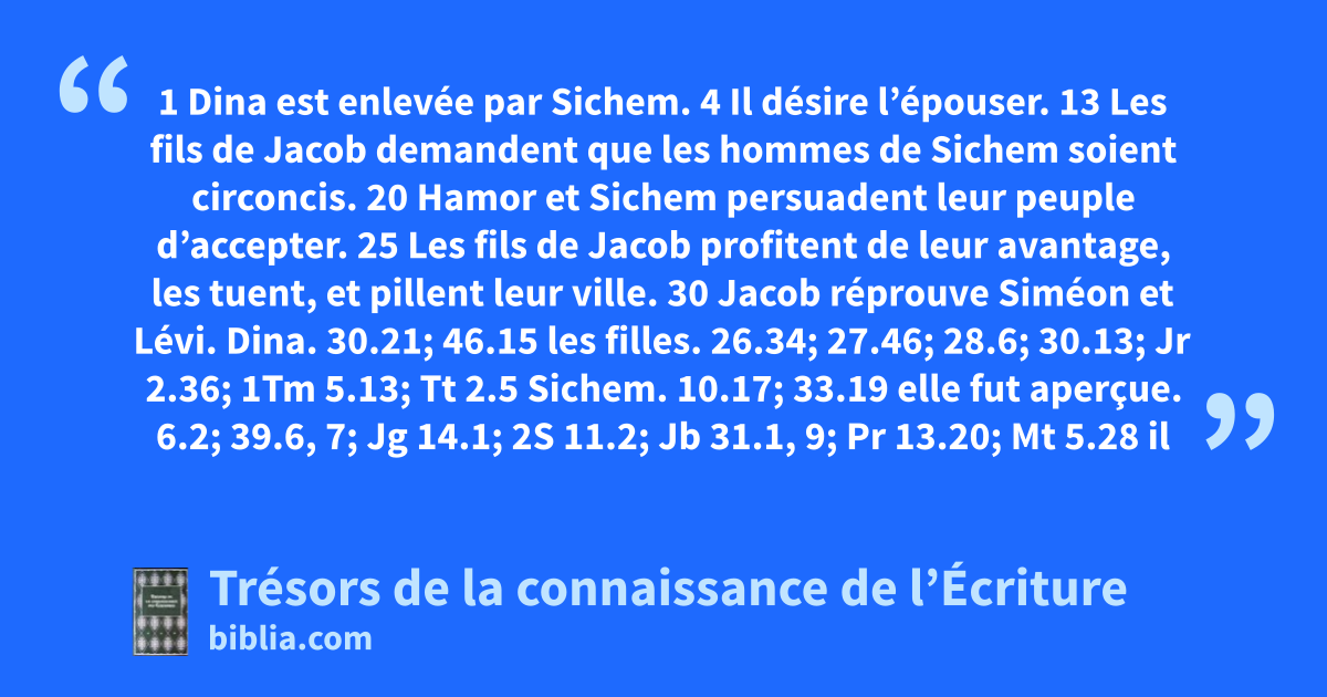 1 Dina est enlevée par Sichem. 4 Il désire l’épouser. 13 Les fils de Jacob demandent que les hommes de Sichem soient circoncis. 20 Hamor et Sichem persuadent leur peuple d’accepter. 25 Les fils de Jacob profitent de leur avantage, les tuent, et pillent leur ville. 30 Jacob réprouve Siméon et Lévi.