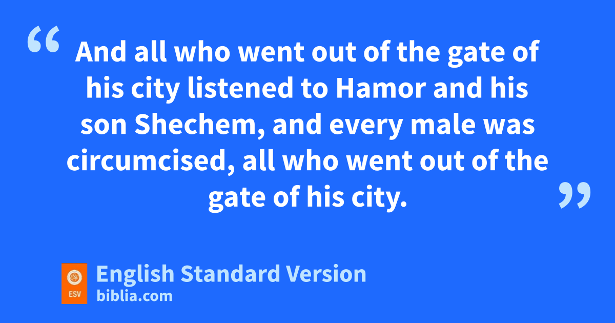 18 Their words pleased Hamor and Hamor’s son Shechem. 19 And the young man did not delay to do the thing, because he delighted in Jacob’s daughter. Now rhe was the most honored of all his father’s house. 20 So Hamor and his son Shechem scame to the gate of their city and spoke to the men of their city, saying, 21 “These men are at peace with us; let them dwell in the land and ttrade in it, for behold, the land is large enough for them. Let us take their daughters as wives, and let us give them our daughters. 22 Only on this condition will the men agree to dwell with us to become one people—when every male among us is circumcised as they are circumcised. 23 Will not their livestock, their property and all their beasts be ours? Only let us agree with them, and they will dwell with us.” 24 And all who went out of the gate of his city listened to Hamor and his son Shechem, and every male was circumcised, all who uwent out of the gate of his city.