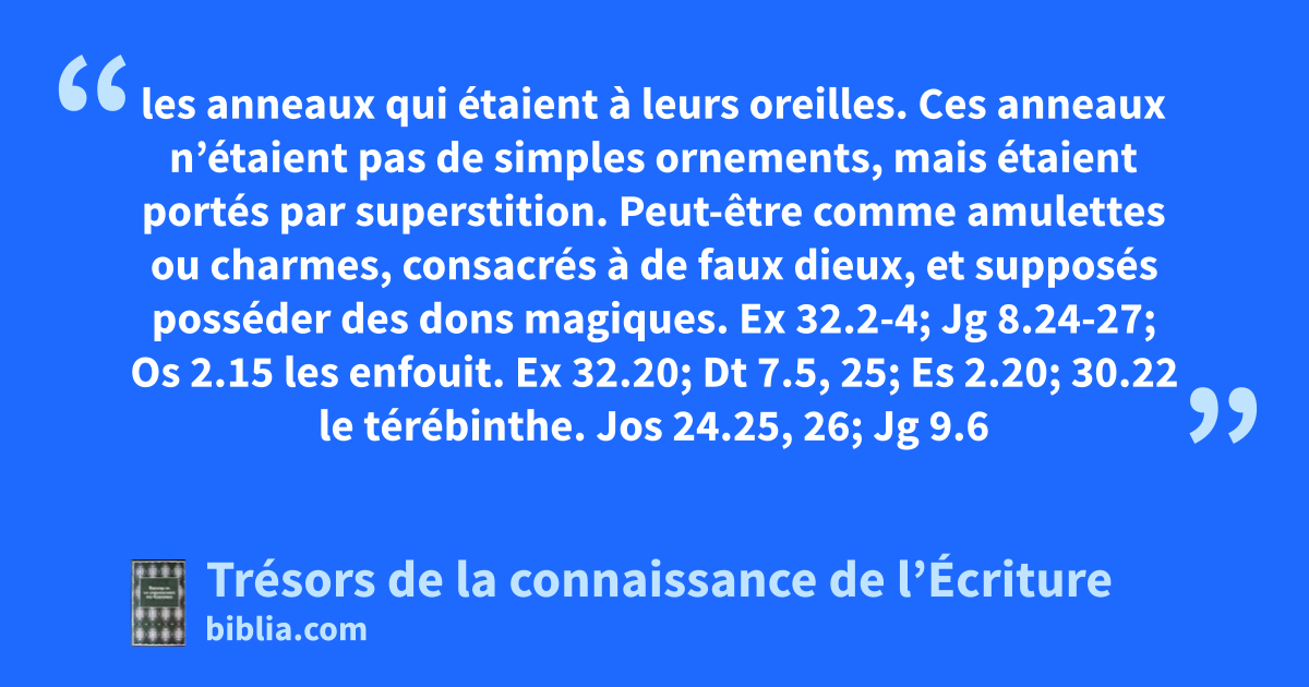 les anneaux qui étaient à leurs oreilles. Ces anneaux n’étaient pas de simples ornements, mais étaient portés par superstition. Peut-être comme amulettes ou charmes, consacrés à de faux dieux, et supposés posséder des dons magiques. Ex 32.2-4; Jg 8.24-27; Os 2.15 les enfouit. Ex 32.20; Dt 7.5, 25; Es 2.20; 30.22 le térébinthe. Jos 24.25, 26; Jg 9.6