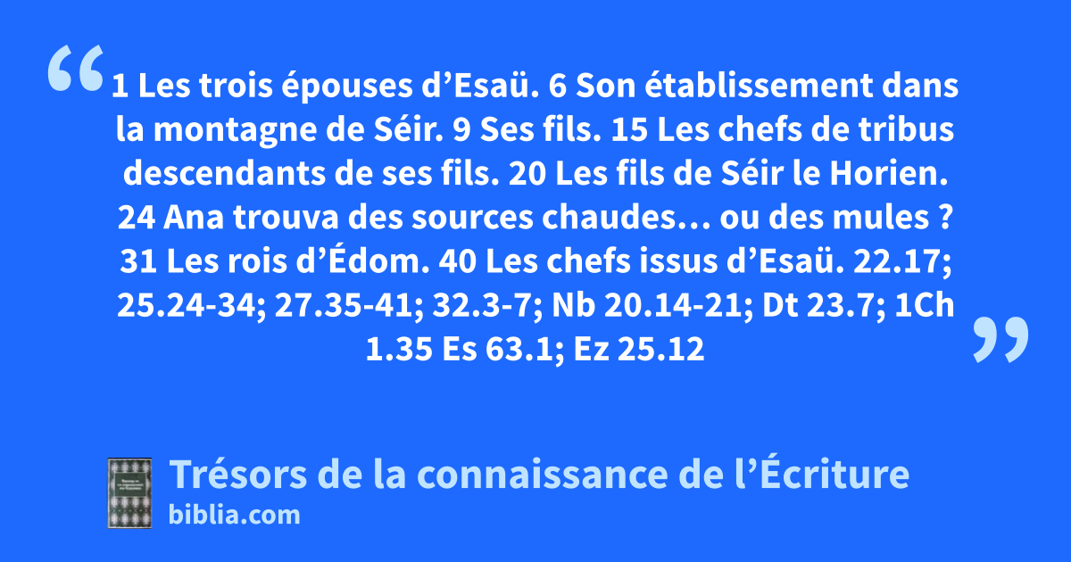 1 Les trois épouses d’Esaü. 6 Son établissement dans la montagne de Séir. 9 Ses fils. 15 Les chefs de tribus descendants de ses fils. 20 Les fils de Séir le Horien. 24 Ana trouva des sources chaudes… ou des mules ? 31 Les rois d’Édom. 40 Les chefs issus d’Esaü.