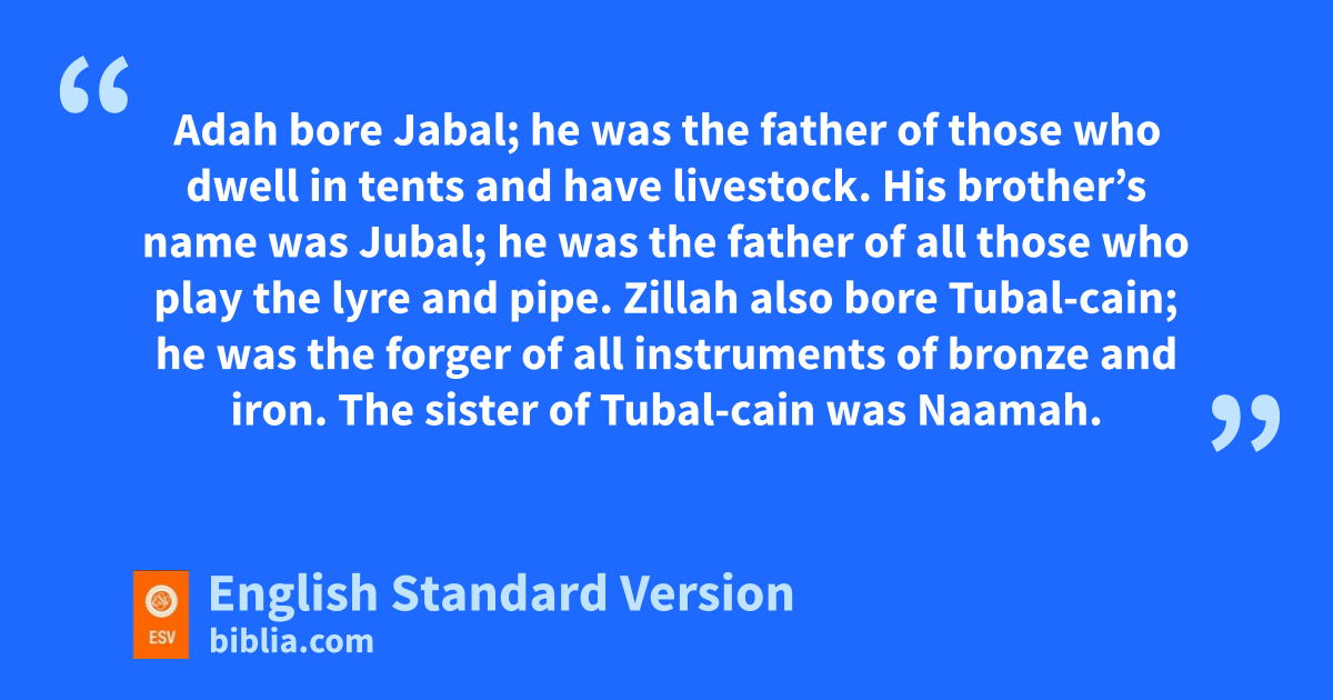 17 Cain knew his wife, and she conceived and bore Enoch. When he built a city, he called the name of the city after the name of his son, Enoch. 18 To Enoch was born Irad, and Irad fathered Mehujael, and Mehujael fathered Methushael, and Methushael fathered Lamech. 19 And Lamech took two wives. The name of the one was Adah, and the name of the other Zillah. 20 Adah bore Jabal; he was the father of those who dwell in tents and have livestock. 21 His brother’s name was Jubal; he was the father of all those who play the lyre and pipe. 22 Zillah also bore Tubal-cain; he was the forger of all instruments of bronze and iron. The sister of Tubal-cain was Naamah.
