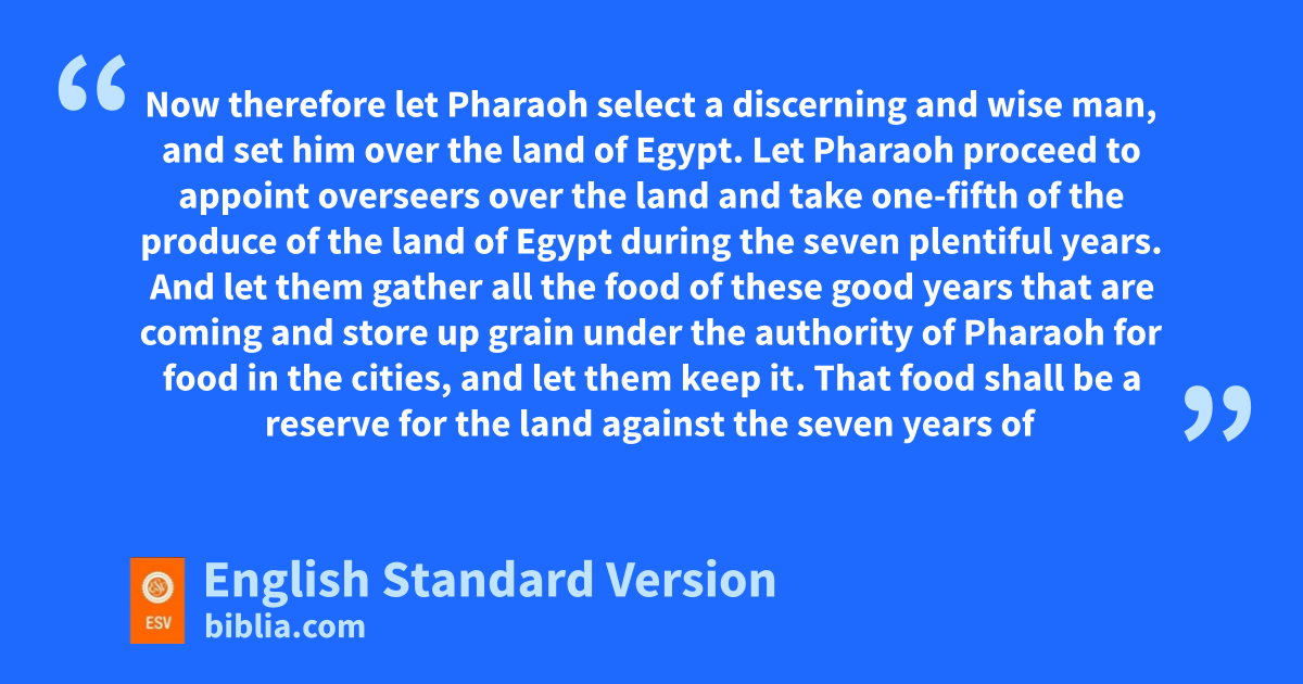 25 Then Joseph said to Pharaoh, “The dreams of Pharaoh are one; mGod has revealed to Pharaoh what he is about to do. 26 The seven good cows are seven years, and the seven good ears are seven years; the dreams are one. 27 The seven lean and ugly cows that came up after them are seven years, and the seven empty ears blighted by the east wind are also nseven years of famine. 28 It is as I told Pharaoh; oGod has shown to Pharaoh what he is about to do. 29 There will come pseven years of great plenty throughout all the land of Egypt, 30 but after them there will arise qseven years of famine, and all the plenty will be forgotten in the land of Egypt. rThe famine will consume the land, 31 and the plenty will be unknown in the land by reason of the famine that will follow, for it will be very severe. 32 And the doubling of Pharaoh’s dream means that the sthing is fixed by God, and God will shortly bring it about. 33 Now therefore let Pharaoh select a discerning and wise man, and set him over the land of Egypt. 34 Let Pharaoh proceed to appoint overseers over the land and take one-fifth of the produce of the land2 of Egypt during the seven plentiful years. 35 And tlet them gather all the food of these good years that are coming and store up grain under the authority of Pharaoh for food in the cities, and let them keep it. 36 That food shall be a reserve for the land against the seven years of famine that are to occur in the land of Egypt, so that the land may not perish through the famine.”
