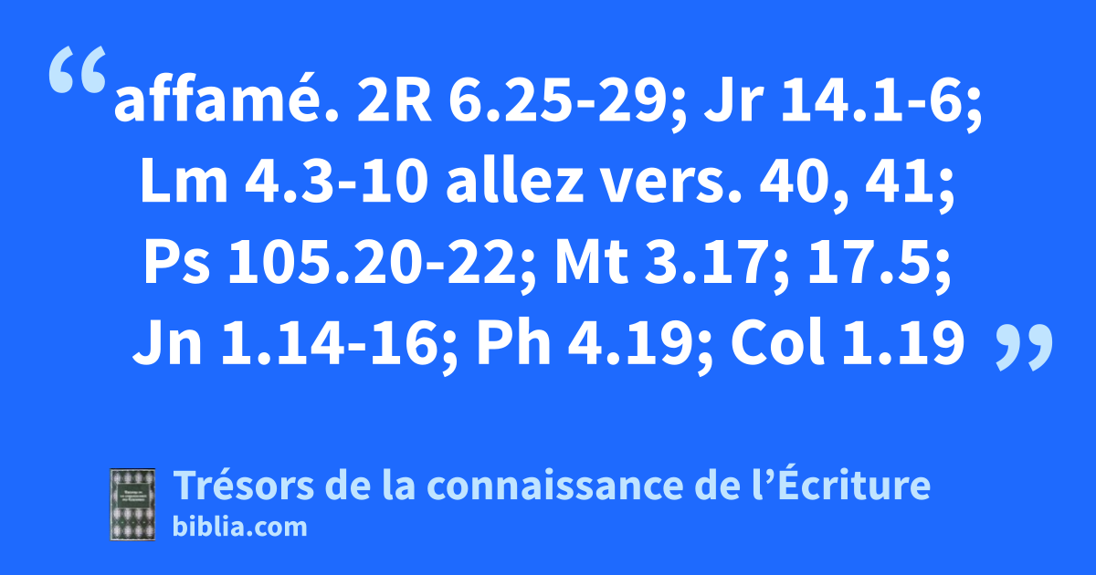 affamé. 2R 6.25-29; Jr 14.1-6; Lm 4.3-10 allez vers. 40, 41; Ps 105.20-22; Mt 3.17; 17.5; Jn 1.14-16; Ph 4.19; Col 1.19