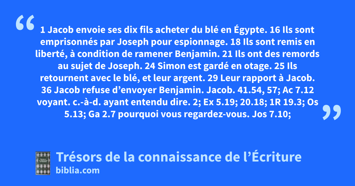 1 Jacob envoie ses dix fils acheter du blé en Égypte. 16 Ils sont emprisonnés par Joseph pour espionnage. 18 Ils sont remis en liberté, à condition de ramener Benjamin. 21 Ils ont des remords au sujet de Joseph. 24 Simon est gardé en otage. 25 Ils retournent avec le blé, et leur argent. 29 Leur rapport à Jacob. 36 Jacob refuse d’envoyer Benjamin.