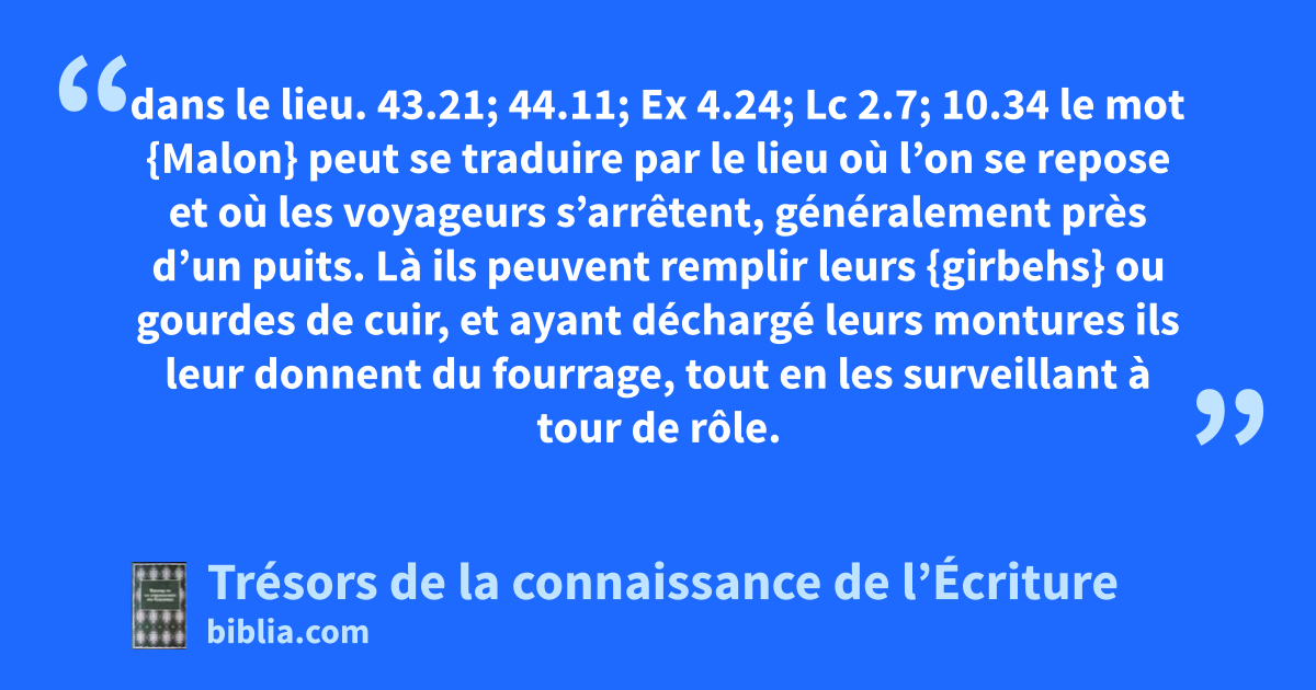 dans le lieu. 43.21; 44.11; Ex 4.24; Lc 2.7; 10.34 le mot {Malon} peut se traduire par le lieu où l’on se repose et où les voyageurs s’arrêtent, généralement près d’un puits. Là ils peuvent remplir leurs {girbehs} ou gourdes de cuir, et ayant déchargé leurs montures ils leur donnent du fourrage, tout en les surveillant à tour de rôle.