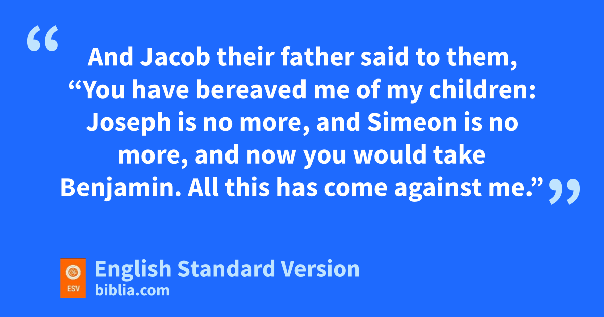 35 kAs they emptied their sacks, behold, every man’s bundle of money was in his sack. And when they and their father saw their bundles of money, they were afraid. 36 And Jacob their father said to them, “You have lbereaved me of my children: Joseph is no more, and Simeon is no more, and now you would take Benjamin. All this has come against me.” 37 Then Reuben said to his father, “Kill mmy two sons if I do not bring him back to you. Put him in my hands, and I will bring him back to you.” 38 But he said, “My son shall not go down with you, for nhis brother is dead, and he is the only one left. oIf harm should happen to him on the journey that you are to make, pyou would bring down my gray hairs with sorrow to Sheol.”