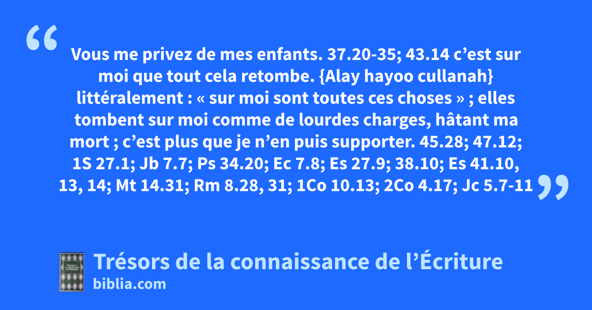 Vous me privez de mes enfants. 37.20-35; 43.14 c’est sur moi que tout cela retombe. {Alay hayoo cullanah} littéralement : « sur moi sont toutes ces choses » ; elles tombent sur moi comme de lourdes charges, hâtant ma mort ; c’est plus que je n’en puis supporter. 45.28; 47.12; 1S 27.1; Jb 7.7; Ps 34.20; Ec 7.8; Es 27.9; 38.10; Es 41.10, 13, 14; Mt 14.31; Rm 8.28, 31; 1Co 10.13; 2Co 4.17; Jc 5.7-11