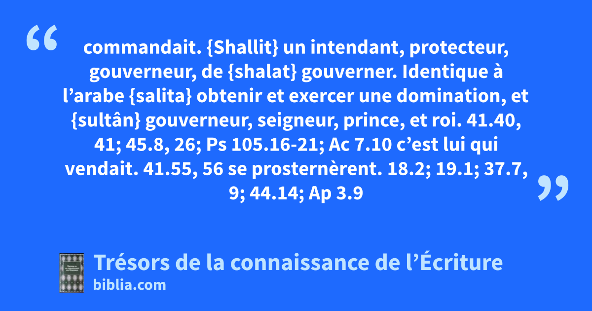 commandait. {Shallit} un intendant, protecteur, gouverneur, de {shalat} gouverner. Identique à l’arabe {salita} obtenir et exercer une domination, et {sultân} gouverneur, seigneur, prince, et roi. 41.40, 41; 45.8, 26; Ps 105.16-21; Ac 7.10 c’est lui qui vendait. 41.55, 56 se prosternèrent. 18.2; 19.1; 37.7, 9; 44.14; Ap 3.9