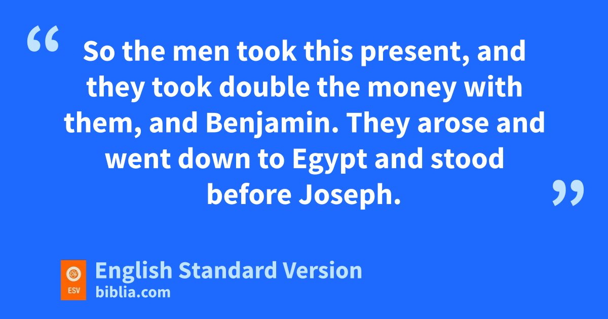 15 So the men took this present, and they took double the money with them, and Benjamin. They arose and went down to Egypt and stood before Joseph.