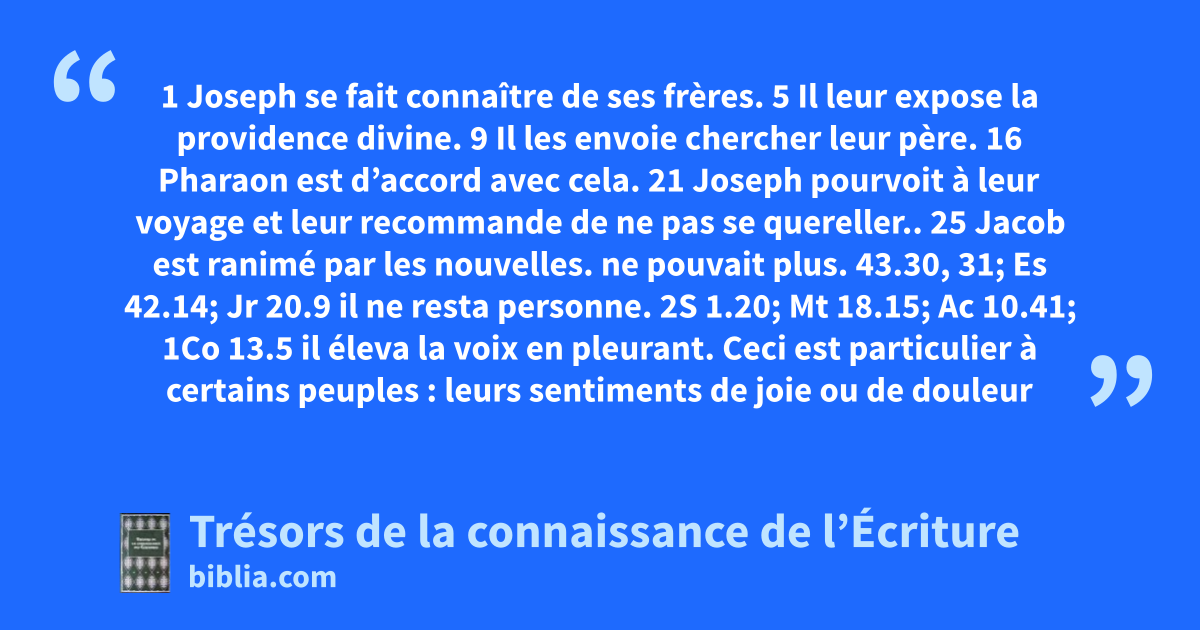 1 Joseph se fait connaître de ses frères. 5 Il leur expose la providence divine. 9 Il les envoie chercher leur père. 16 Pharaon est d’accord avec cela. 21 Joseph pourvoit à leur voyage et leur recommande de ne pas se quereller.. 25 Jacob est ranimé par les nouvelles.