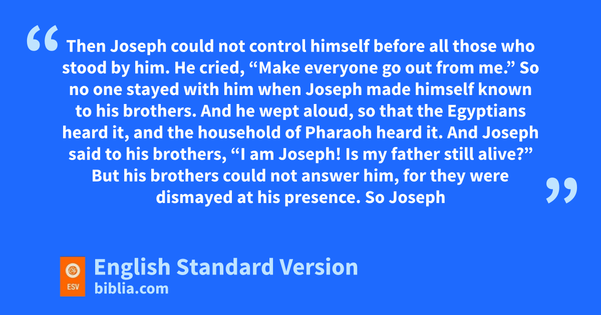 45 Then Joseph could not pcontrol himself before all those who stood by him. He cried, “Make everyone go out from me.” So no one stayed with him when Joseph made himself known to his brothers. 2 And he wept aloud, so that the Egyptians heard it, and the household of Pharaoh heard it. 3 And Joseph said to his brothers, q“I am Joseph! Is my father still alive?” But his brothers could not answer him, for they were dismayed at his presence.