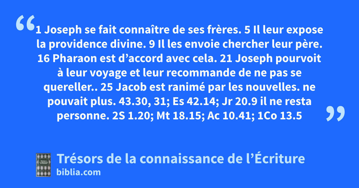 1 Joseph se fait connaître de ses frères. 5 Il leur expose la providence divine. 9 Il les envoie chercher leur père. 16 Pharaon est d’accord avec cela. 21 Joseph pourvoit à leur voyage et leur recommande de ne pas se quereller.. 25 Jacob est ranimé par les nouvelles.