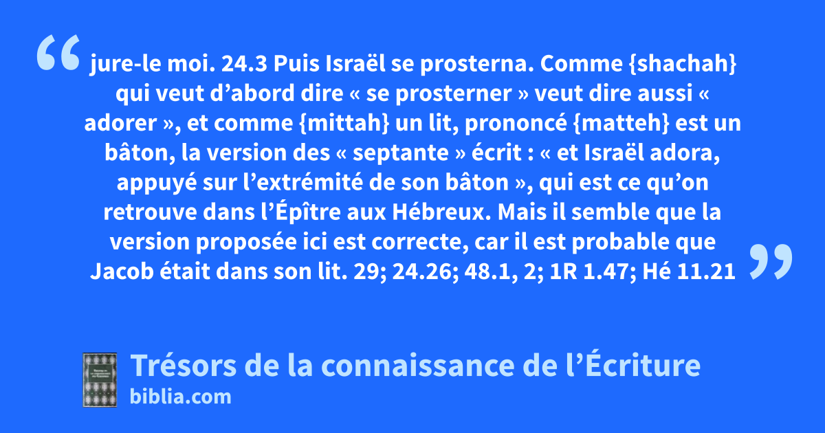 jure-le moi. 24.3 Puis Israël se prosterna. Comme {shachah} qui veut d’abord dire « se prosterner » veut dire aussi « adorer », et comme {mittah} un lit, prononcé {matteh} est un bâton, la version des « septante » écrit : « et Israël adora, appuyé sur l’extrémité de son bâton », qui est ce qu’on retrouve dans l’Épître aux Hébreux. Mais il semble que la version proposée ici est correcte, car il est probable que Jacob était dans son lit. 29; 24.26; 48.1, 2; 1R 1.47; Hé 11.21