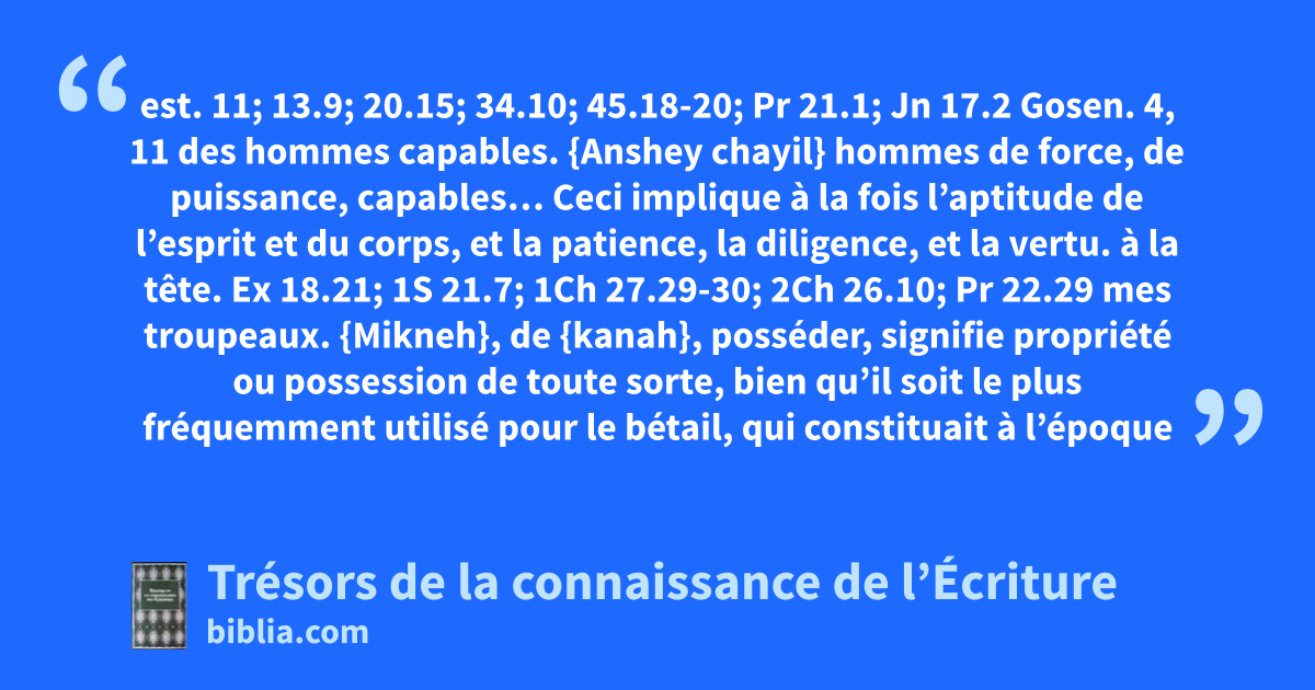 est. 11; 13.9; 20.15; 34.10; 45.18-20; Pr 21.1; Jn 17.2 Gosen. 4, 11 des hommes capables. {Anshey chayil} hommes de force, de puissance, capables… Ceci implique à la fois l’aptitude de l’esprit et du corps, et la patience, la diligence, et la vertu. à la tête. Ex 18.21; 1S 21.7; 1Ch 27.29-30; 2Ch 26.10; Pr 22.29 mes troupeaux. {Mikneh}, de {kanah}, posséder, signifie propriété ou possession de toute sorte, bien qu’il soit le plus fréquemment utilisé pour le bétail, qui constituait à l’époque la plus grande partie des possessions des hommes. 16; Ex 9.3-6, 10, 21