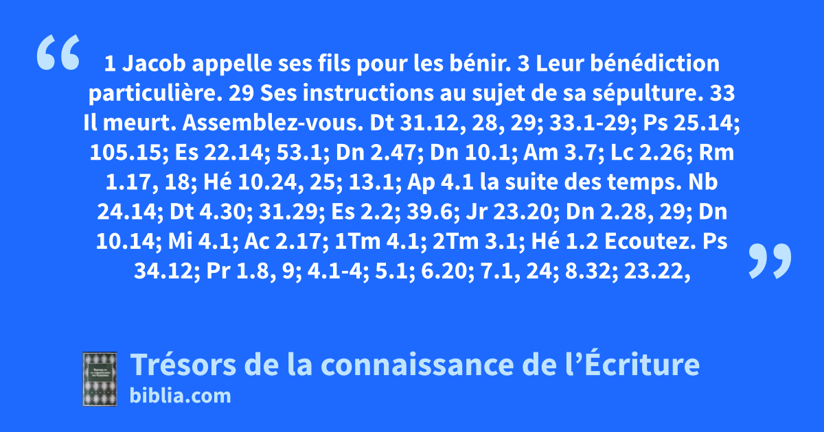 1 Jacob appelle ses fils pour les bénir. 3 Leur bénédiction particulière. 29 Ses instructions au sujet de sa sépulture. 33 Il meurt.