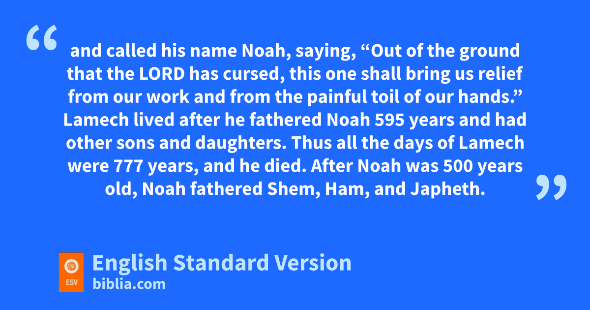 28 When Lamech had lived 182 years, he fathered a son 29 and called his name Noah, saying, “Out of the ground wthat the Lord has cursed, this one shall bring us relief4 from our work and from the painful toil of our hands.” 30 Lamech lived after he fathered Noah 595 years and had other sons and daughters. 31 Thus all the days of Lamech were 777 years, and he died.
