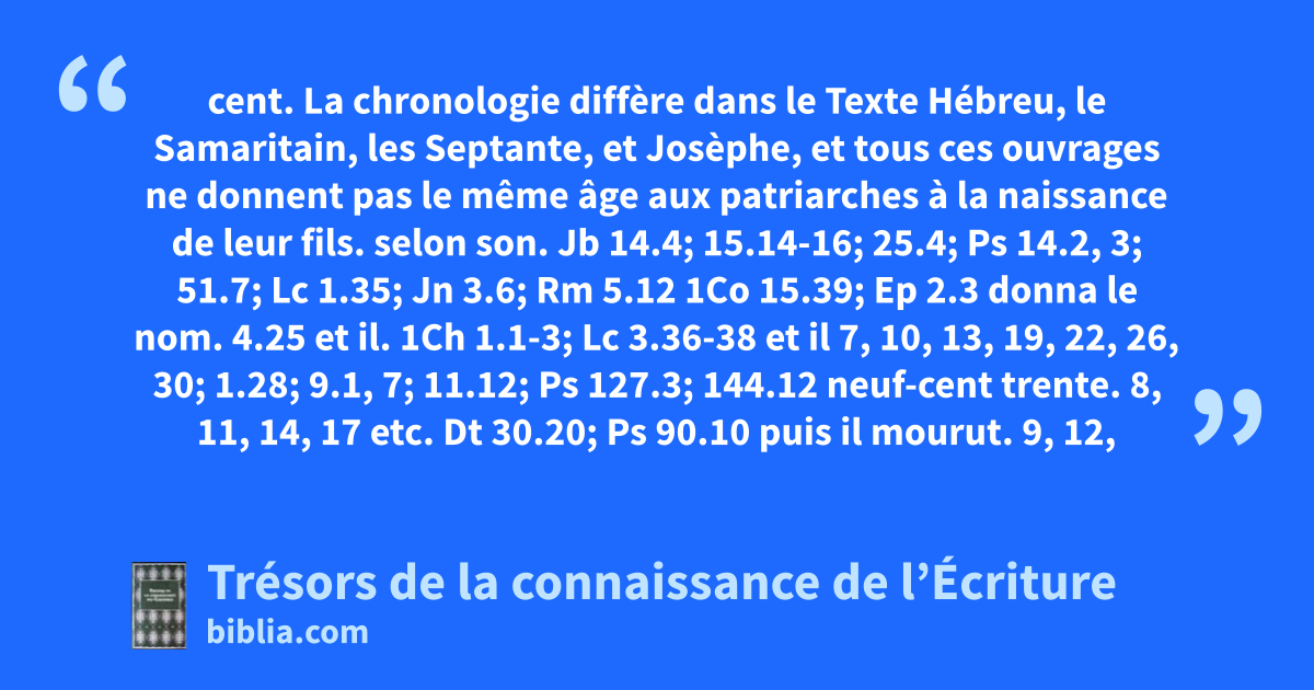 cent. La chronologie diffère dans le Texte Hébreu, le Samaritain, les Septante, et Josèphe, et tous ces ouvrages ne donnent pas le même âge aux patriarches à la naissance de leur fils. selon son. Jb 14.4; 15.14-16; 25.4; Ps 14.2, 3; 51.7; Lc 1.35; Jn 3.6; Rm 5.12 1Co 15.39; Ep 2.3 donna le nom. 4.25