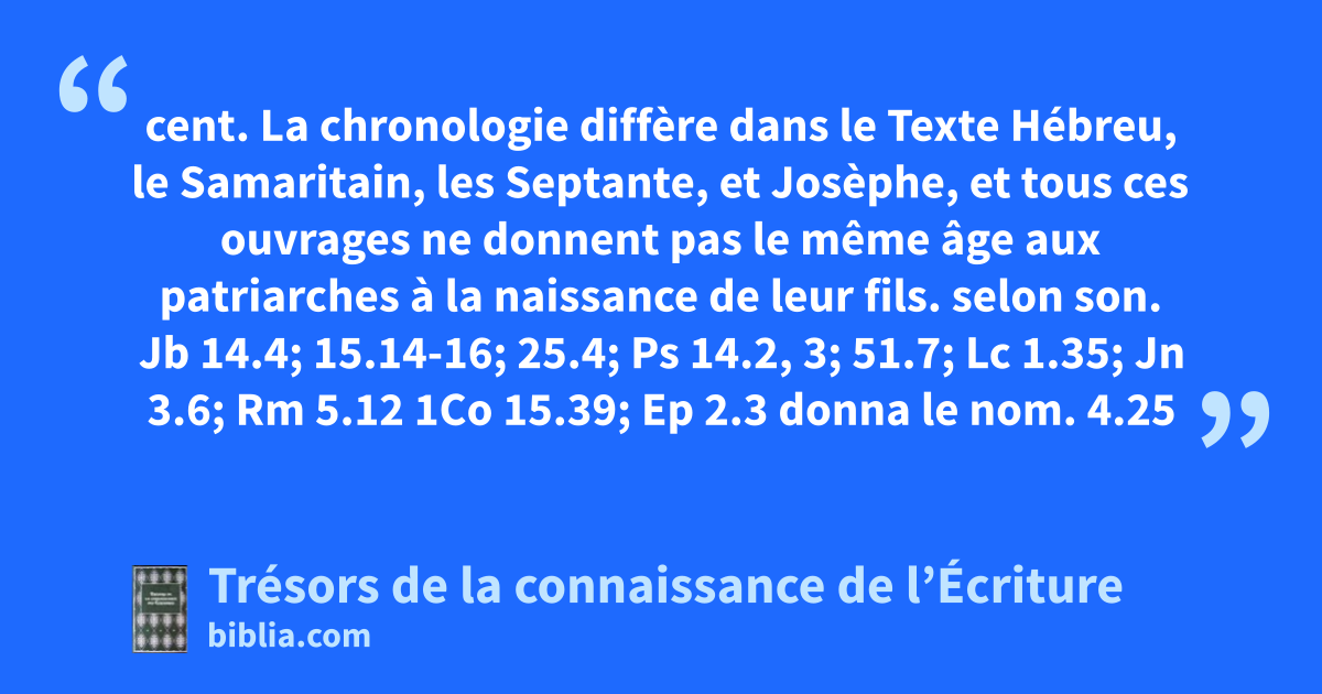 cent. La chronologie diffère dans le Texte Hébreu, le Samaritain, les Septante, et Josèphe, et tous ces ouvrages ne donnent pas le même âge aux patriarches à la naissance de leur fils. selon son. Jb 14.4; 15.14-16; 25.4; Ps 14.2, 3; 51.7; Lc 1.35; Jn 3.6; Rm 5.12 1Co 15.39; Ep 2.3 donna le nom. 4.25