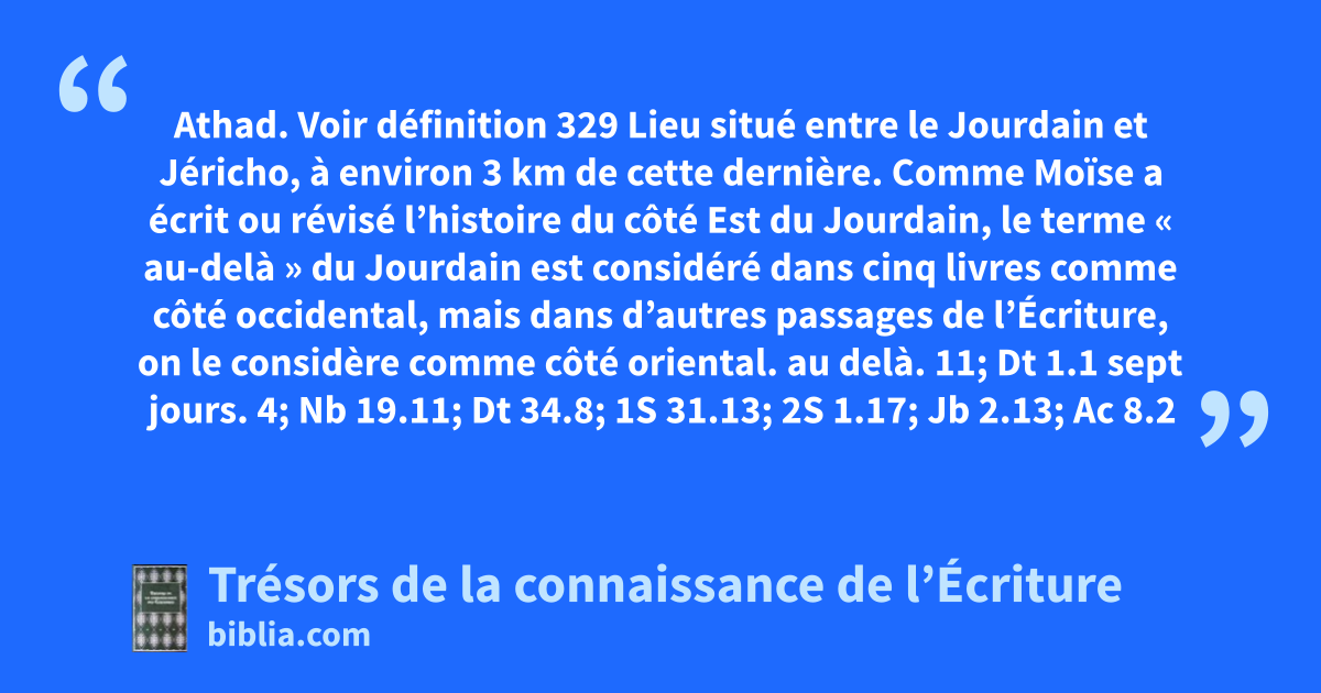 Athad. Voir définition 329 Lieu situé entre le Jourdain et Jéricho, à environ 3 km de cette dernière. Comme Moïse a écrit ou révisé l’histoire du côté Est du Jourdain, le terme « au-delà » du Jourdain est considéré dans cinq livres comme côté occidental, mais dans d’autres passages de l’Écriture, on le considère comme côté oriental. au delà. 11; Dt 1.1 sept jours. 4; Nb 19.11; Dt 34.8; 1S 31.13; 2S 1.17; Jb 2.13; Ac 8.2