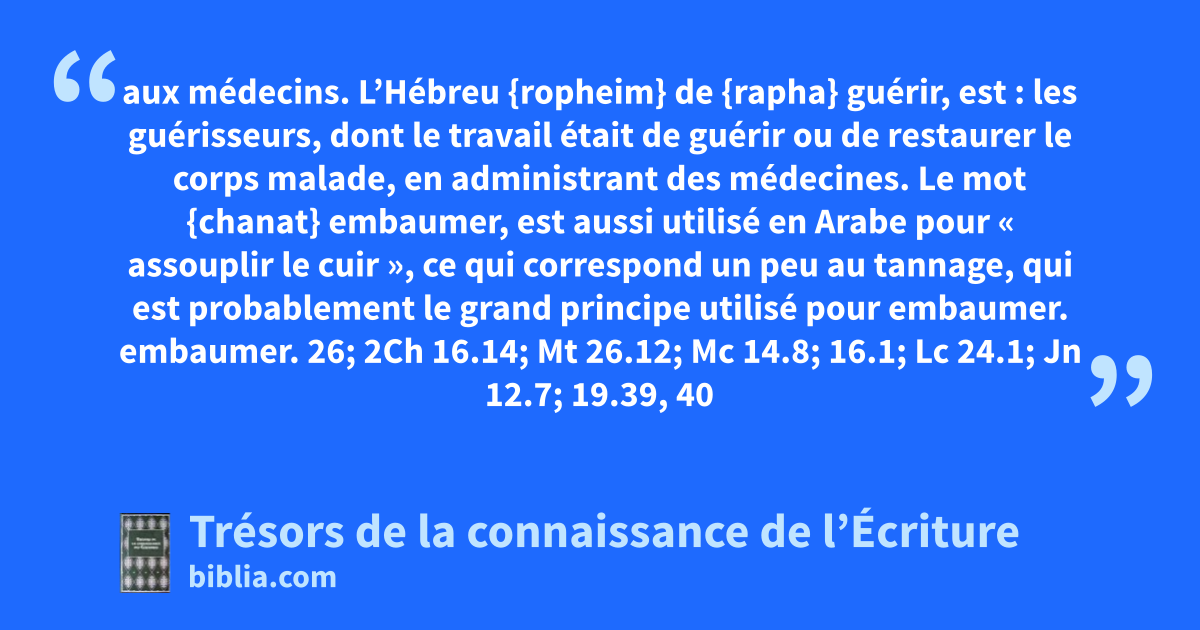 aux médecins. L’Hébreu {ropheim} de {rapha} guérir, est : les guérisseurs, dont le travail était de guérir ou de restaurer le corps malade, en administrant des médecines. Le mot {chanat} embaumer, est aussi utilisé en Arabe pour « assouplir le cuir », ce qui correspond un peu au tannage, qui est probablement le grand principe utilisé pour embaumer. embaumer. 26; 2Ch 16.14; Mt 26.12; Mc 14.8; 16.1; Lc 24.1; Jn 12.7; 19.39, 40