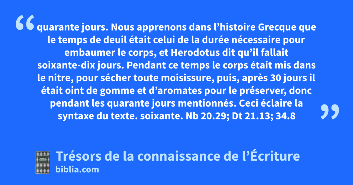 quarante jours. Nous apprenons dans l’histoire Grecque que le temps de deuil était celui de la durée nécessaire pour embaumer le corps, et Herodotus dit qu’il fallait soixante-dix jours. Pendant ce temps le corps était mis dans le nitre, pour sécher toute moisissure, puis, après 30 jours il était oint de gomme et d’aromates pour le préserver, donc pendant les quarante jours mentionnés. Ceci éclaire la syntaxe du texte. soixante. Nb 20.29; Dt 21.13; 34.8
