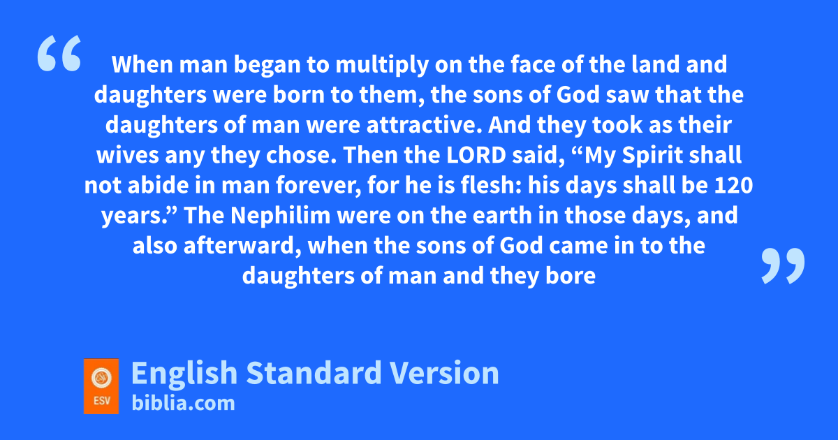 6 When man began to multiply on the face of the land and daughters were born to them, 2 the sons of God saw that the daughters of man were attractive. And they took as their wives any they chose. 3 Then the Lord said, z“My Spirit shall not abide in1 man forever, afor he is flesh: his days shall be 120 years.” 4 The Nephilim2 were on the earth in those days, and also afterward, when the sons of God came in to the daughters of man and they bore children to them. These were the mighty men who were of old, the men of renown.