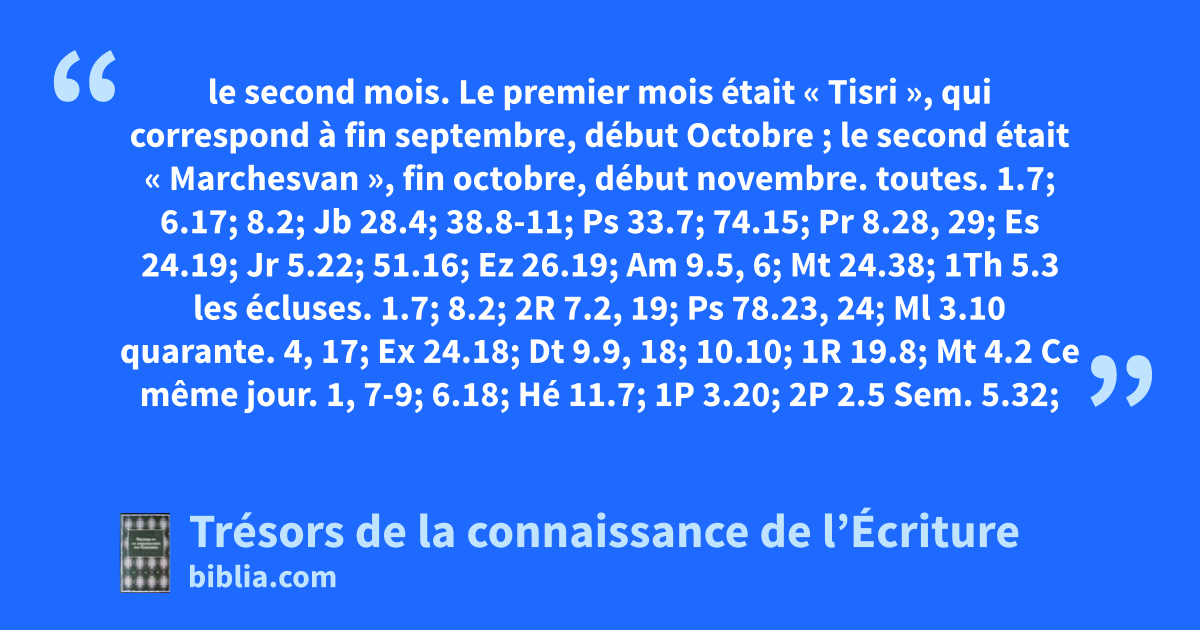 le second mois. Le premier mois était « Tisri », qui correspond à fin septembre, début Octobre ; le second était « Marchesvan », fin octobre, début novembre. toutes. 1.7; 6.17; 8.2; Jb 28.4; 38.8-11; Ps 33.7; 74.15; Pr 8.28, 29; Es 24.19; Jr 5.22; 51.16; Ez 26.19; Am 9.5, 6; Mt 24.38; 1Th 5.3 les écluses. 1.7; 8.2; 2R 7.2, 19; Ps 78.23, 24; Ml 3.10