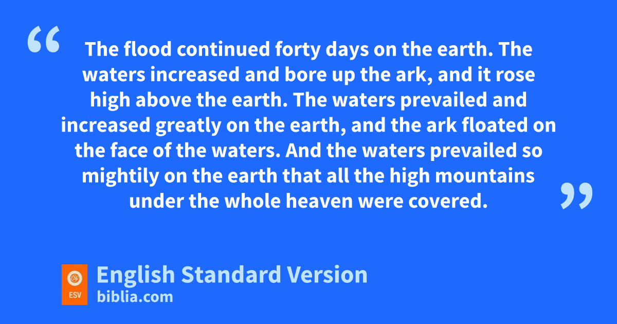 17 The flood zcontinued forty days on the earth. The waters increased and bore up the ark, and it rose high above the earth. 18 The waters prevailed and increased greatly on the earth, and the ark floated on the face of the waters. 19 And the waters prevailed so mightily on the earth that all the high mountains under the whole heaven were covered. 20 The waters prevailed above the mountains, covering them fifteen cubits4 deep. 21 And aall flesh died that moved on the earth, birds, livestock, beasts, all swarming creatures that swarm on the earth, and all mankind. 22 Everything on the dry land bin whose nostrils was the breath of life died. 23 He blotted out every living thing that was on the face of the ground, man and animals and creeping things and birds of the heavens. They were blotted out from the earth. Only cNoah was left, and those who were with him in the ark. 24 And the waters prevailed on the earth 150 days.