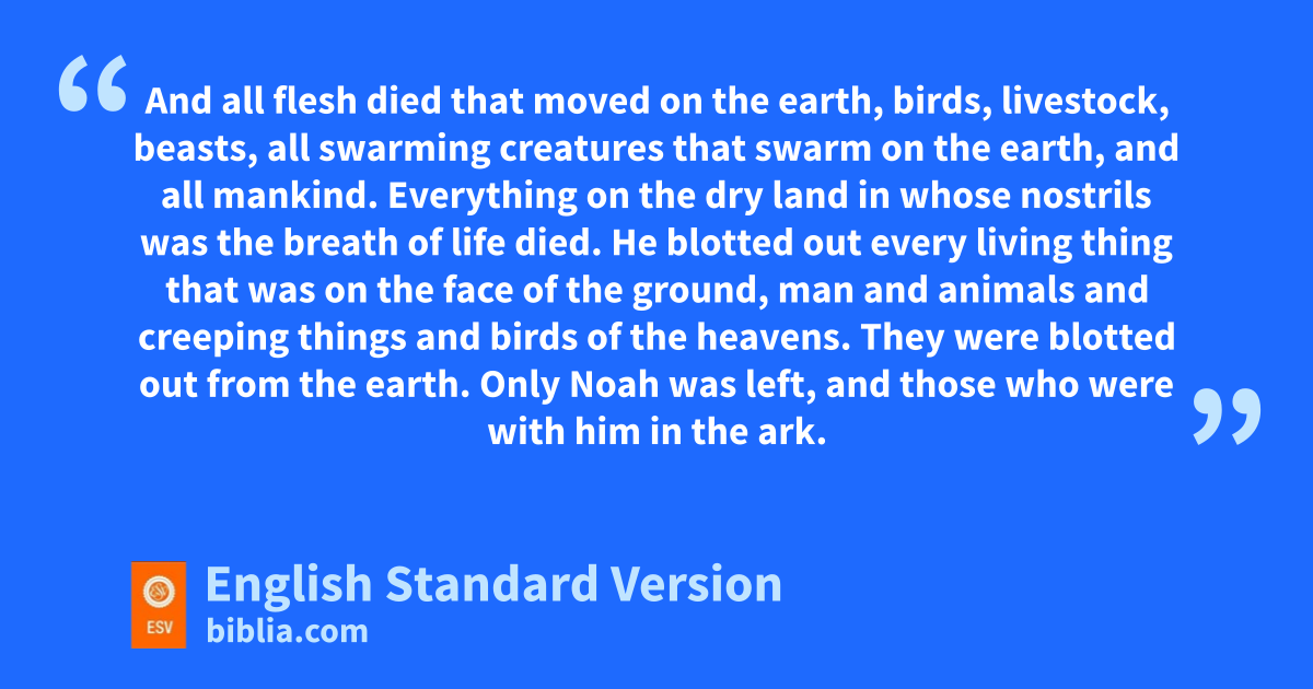 17 The flood zcontinued forty days on the earth. The waters increased and bore up the ark, and it rose high above the earth. 18 The waters prevailed and increased greatly on the earth, and the ark floated on the face of the waters. 19 And the waters prevailed so mightily on the earth that all the high mountains under the whole heaven were covered. 20 The waters prevailed above the mountains, covering them fifteen cubits4 deep. 21 And aall flesh died that moved on the earth, birds, livestock, beasts, all swarming creatures that swarm on the earth, and all mankind. 22 Everything on the dry land bin whose nostrils was the breath of life died. 23 He blotted out every living thing that was on the face of the ground, man and animals and creeping things and birds of the heavens. They were blotted out from the earth. Only cNoah was left, and those who were with him in the ark. 24 And the waters prevailed on the earth 150 days.