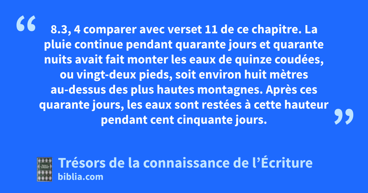 8.3, 4 comparer avec verset 11 de ce chapitre. La pluie continue pendant quarante jours et quarante nuits avait fait monter les eaux de quinze coudées, ou vingt-deux pieds, soit environ huit mètres au-dessus des plus hautes montagnes. Après ces quarante jours, les eaux sont restées à cette hauteur pendant cent cinquante jours.