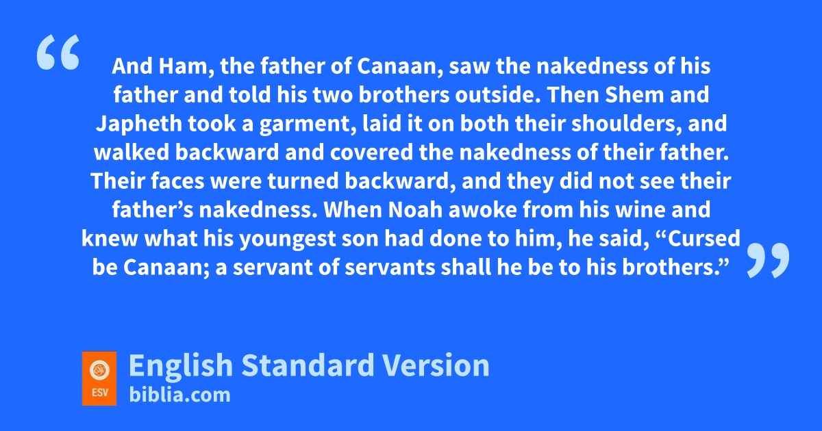 20 Noah began to be a man of the soil, and he planted a vineyard.3 21 He drank of the wine and became drunk and lay uncovered in his tent. 22 And Ham, the father of Canaan, saw the nakedness of his father and told his two brothers outside. 23 Then Shem and Japheth took a garment, laid it on both their shoulders, and walked backward and covered the nakedness of their father. Their faces were turned backward, and they did not see their father’s nakedness. 24 When Noah awoke from his wine hand knew what his youngest son had done to him, 25 he said,