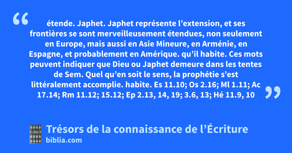 étende. Japhet. Japhet représente l’extension, et ses frontières se sont merveilleusement étendues, non seulement en Europe, mais aussi en Asie Mineure, en Arménie, en Espagne, et probablement en Amérique. qu’il habite. Ces mots peuvent indiquer que Dieu ou Japhet demeure dans les tentes de Sem. Quel qu’en soit le sens, la prophétie s’est littéralement accomplie. habite. Es 11.10; Os 2.16; Ml 1.11; Ac 17.14; Rm 11.12; 15.12; Ep 2.13, 14, 19; 3.6, 13; Hé 11.9, 10