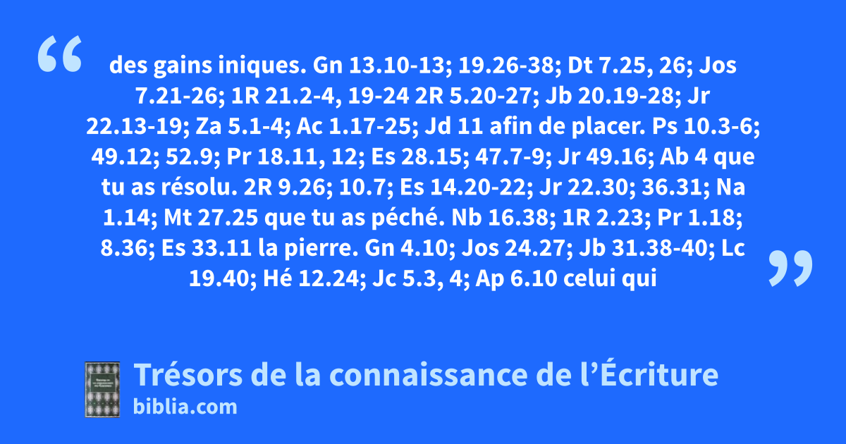 des gains iniques. Gn 13.10-13; 19.26-38; Dt 7.25, 26; Jos 7.21-26; 1R 21.2-4, 19-24 2R 5.20-27; Jb 20.19-28; Jr 22.13-19; Za 5.1-4; Ac 1.17-25; Jd 11 afin de placer. Ps 10.3-6; 49.12; 52.9; Pr 18.11, 12; Es 28.15; 47.7-9; Jr 49.16; Ab 4