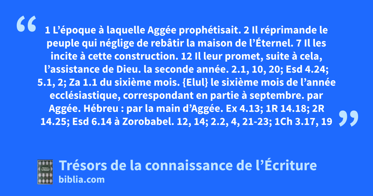 la seconde année. 2.1, 10, 20; Esd 4.24; 5.1, 2; Za 1.1 du sixième mois. {Elul} le sixième mois de l’année ecclésiastique, correspondant en partie à septembre. par Aggée. Hébreu : par la main d’Aggée. Ex 4.13; 1R 14.18; 2R 14.25; Esd 6.14 à Zorobabel. 12, 14; 2.2, 4, 21-23; 1Ch 3.17, 19 fils de Schealthiel. Esd 2.2; 3.2, 8; 4.2; 5.2; Né 7.7; Za 4.6-10; Mt 1.12, 13 Zorobabel, Salathiel. Lc 3.27 gouverneur. Ou : capitaine. Esd 1.8; 2.63; Né 5.14; 8.9 et à Josué. Esd 2.2; 3.8; 5.2; Né 12.1, 10 fils de Jotsadak. 1Ch 6.14, 15 Jehotsadak.