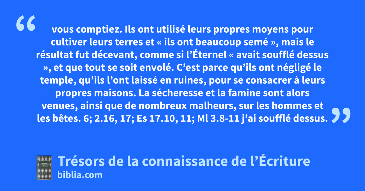 vous comptiez. Ils ont utilisé leurs propres moyens pour cultiver leurs terres et « ils ont beaucoup semé », mais le résultat fut décevant, comme si l’Éternel « avait soufflé dessus », et que tout se soit envolé. C’est parce qu’ils ont négligé le temple, qu’ils l’ont laissé en ruines, pour se consacrer à leurs propres maisons. La sécheresse et la famine sont alors venues, ainsi que de nombreux malheurs, sur les hommes et les bêtes. 6; 2.16, 17; Es 17.10, 11; Ml 3.8-11 j’ai soufflé dessus. 2S 22.16; 2R 19.7; Es 40.7; Ml 2.2 pourquoi ? Jb 10.2; Ps 77.6-11 à cause. 4; Jos 7.10-15; 2S 21.1; Mt 10.37, 38; 1Co 11.30-32; Ap 2.4; 3.19