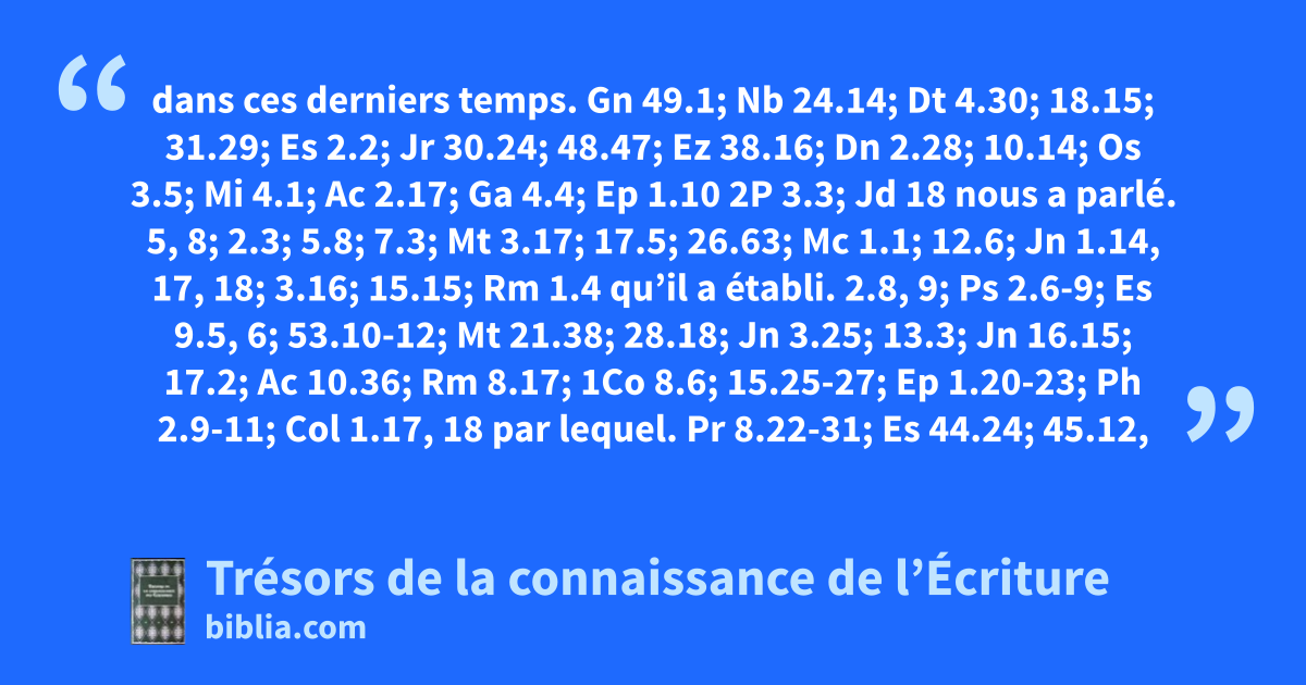 dans ces derniers temps. Gn 49.1; Nb 24.14; Dt 4.30; 18.15; 31.29; Es 2.2; Jr 30.24; 48.47; Ez 38.16; Dn 2.28; 10.14; Os 3.5; Mi 4.1; Ac 2.17; Ga 4.4; Ep 1.10 2P 3.3; Jd 18 nous a parlé. 5, 8; 2.3; 5.8; 7.3; Mt 3.17; 17.5; 26.63; Mc 1.1; 12.6; Jn 1.14, 17, 18; 3.16; 15.15; Rm 1.4 qu’il a établi. 2.8, 9; Ps 2.6-9; Es 9.5, 6; 53.10-12; Mt 21.38; 28.18; Jn 3.25; 13.3; Jn 16.15; 17.2; Ac 10.36; Rm 8.17; 1Co 8.6; 15.25-27; Ep 1.20-23; Ph 2.9-11; Col 1.17, 18 par lequel. Pr 8.22-31; Es 44.24; 45.12, 18; Jn 1.3; 1Co 8.6; Ep 3.9; Col 1.16, 17