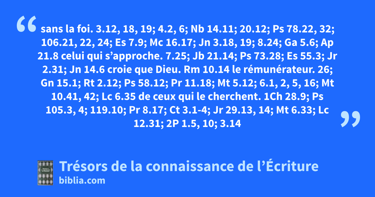 sans la foi. 3.12, 18, 19; 4.2, 6; Nb 14.11; 20.12; Ps 78.22, 32; 106.21, 22, 24; Es 7.9; Mc 16.17; Jn 3.18, 19; 8.24; Ga 5.6; Ap 21.8 celui qui s’approche. 7.25; Jb 21.14; Ps 73.28; Es 55.3; Jr 2.31; Jn 14.6 croie que Dieu. Rm 10.14 le rémunérateur. 26; Gn 15.1; Rt 2.12; Ps 58.12; Pr 11.18; Mt 5.12; 6.1, 2, 5, 16; Mt 10.41, 42; Lc 6.35 de ceux qui le cherchent. 1Ch 28.9; Ps 105.3, 4; 119.10; Pr 8.17; Ct 3.1-4; Jr 29.13, 14; Mt 6.33; Lc 12.31; 2P 1.5, 10; 3.14