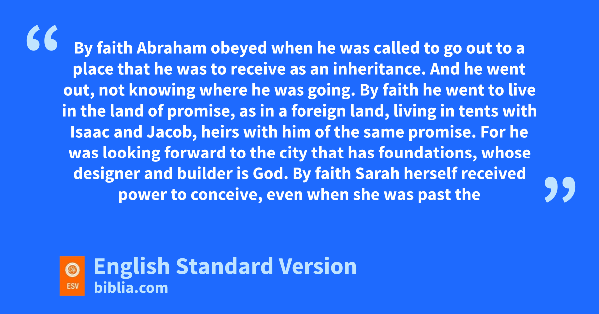 8 By faith qAbraham obeyed when he was called to go out to a place rthat he was to receive as an inheritance. And he went out, not knowing where he was going. 9 By faith he went to live in sthe land of promise, as in a foreign land, tliving in tents uwith Isaac and Jacob, heirs with him of the same promise. 10 For he was looking forward to vthe city that has wfoundations, xwhose designer and builder is God. 11 By faith ySarah herself received power to conceive, even when she was past the age, since she considered zhim faithful who had promised. 12 Therefore from one man, and ahim as good as dead, were born descendants bas many as the stars of heaven and as many as the innumerable grains of sand by the seashore.