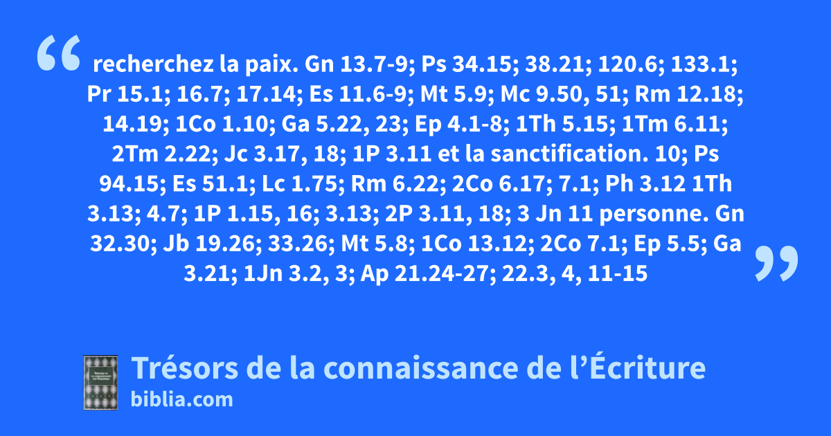 recherchez la paix. Gn 13.7-9; Ps 34.15; 38.21; 120.6; 133.1; Pr 15.1; 16.7; 17.14; Es 11.6-9; Mt 5.9; Mc 9.50, 51; Rm 12.18; 14.19; 1Co 1.10; Ga 5.22, 23; Ep 4.1-8; 1Th 5.15; 1Tm 6.11; 2Tm 2.22; Jc 3.17, 18; 1P 3.11 et la sanctification. 10; Ps 94.15; Es 51.1; Lc 1.75; Rm 6.22; 2Co 6.17; 7.1; Ph 3.12 1Th 3.13; 4.7; 1P 1.15, 16; 3.13; 2P 3.11, 18; 3 Jn 11 personne. Gn 32.30; Jb 19.26; 33.26; Mt 5.8; 1Co 13.12; 2Co 7.1; Ep 5.5; Ga 3.21; 1Jn 3.2, 3; Ap 21.24-27; 22.3, 4, 11-15