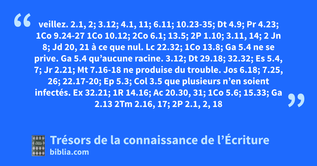 veillez. 2.1, 2; 3.12; 4.1, 11; 6.11; 10.23-35; Dt 4.9; Pr 4.23; 1Co 9.24-27 1Co 10.12; 2Co 6.1; 13.5; 2P 1.10; 3.11, 14; 2 Jn 8; Jd 20, 21 à ce que nul. Lc 22.32; 1Co 13.8; Ga 5.4 ne se prive. Ga 5.4 qu’aucune racine. 3.12; Dt 29.18; 32.32; Es 5.4, 7; Jr 2.21; Mt 7.16-18 ne produise du trouble. Jos 6.18; 7.25, 26; 22.17-20; Ep 5.3; Col 3.5 que plusieurs n’en soient infectés. Ex 32.21; 1R 14.16; Ac 20.30, 31; 1Co 5.6; 15.33; Ga 2.13 2Tm 2.16, 17; 2P 2.1, 2, 18