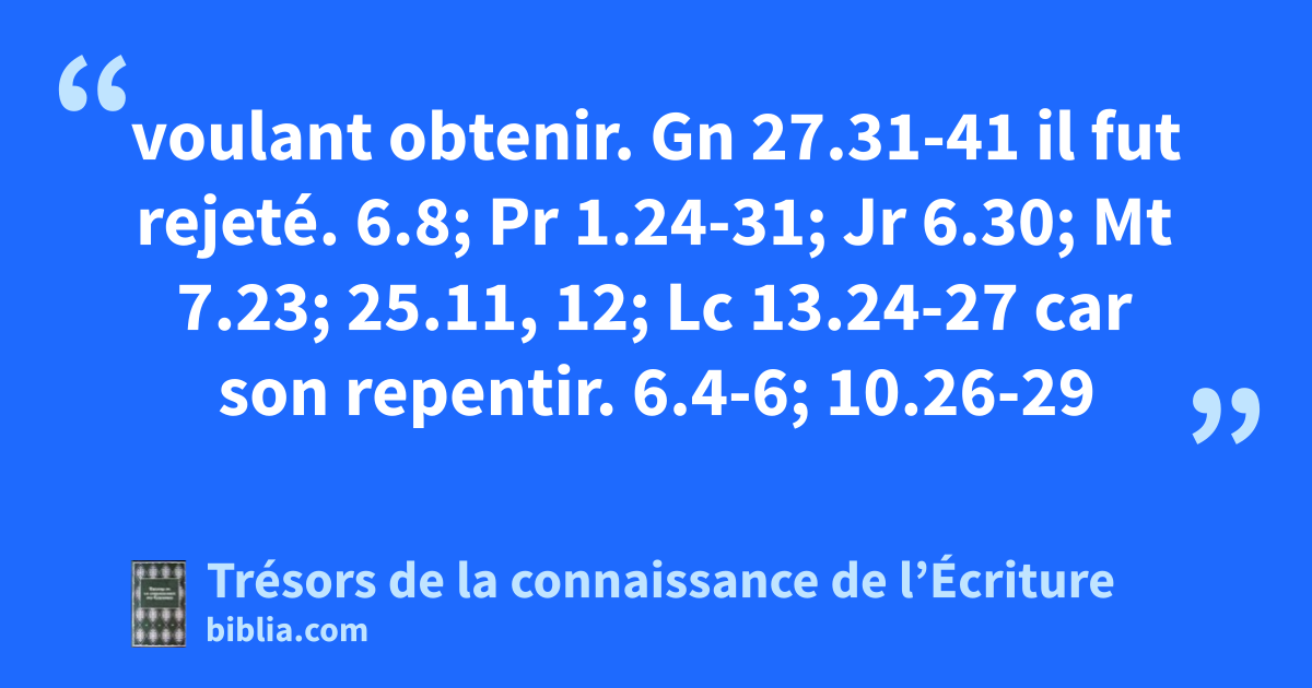 voulant obtenir. Gn 27.31-41 il fut rejeté. 6.8; Pr 1.24-31; Jr 6.30; Mt 7.23; 25.11, 12; Lc 13.24-27 car son repentir. 6.4-6; 10.26-29
