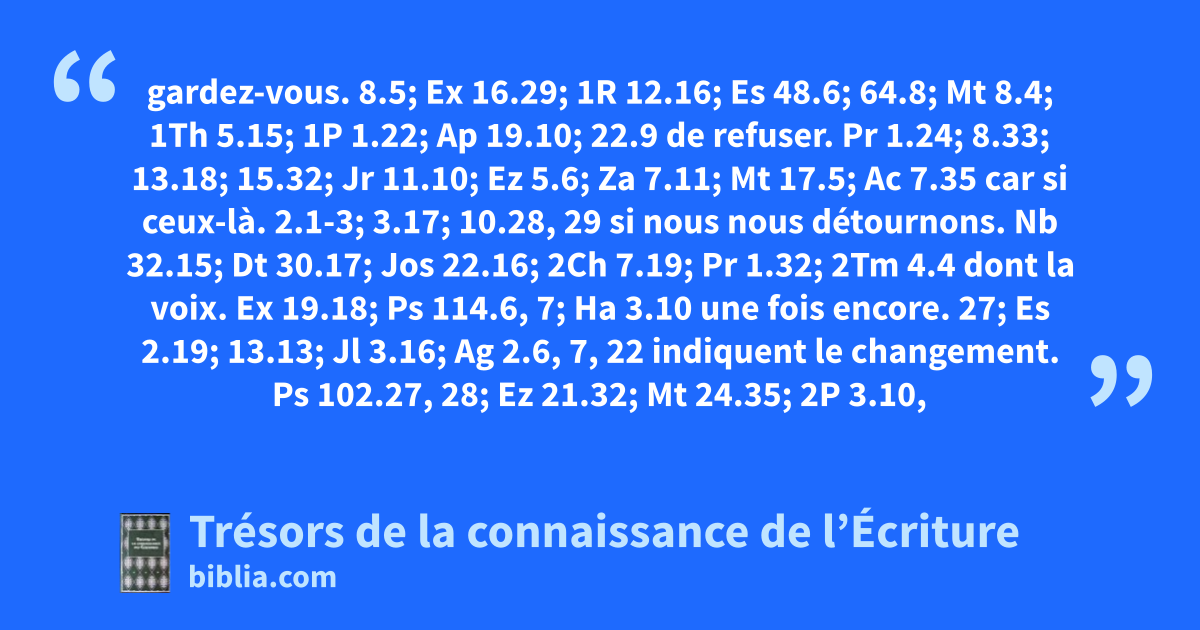 gardez-vous. 8.5; Ex 16.29; 1R 12.16; Es 48.6; 64.8; Mt 8.4; 1Th 5.15; 1P 1.22; Ap 19.10; 22.9 de refuser. Pr 1.24; 8.33; 13.18; 15.32; Jr 11.10; Ez 5.6; Za 7.11; Mt 17.5; Ac 7.35 car si ceux-là. 2.1-3; 3.17; 10.28, 29 si nous nous détournons. Nb 32.15; Dt 30.17; Jos 22.16; 2Ch 7.19; Pr 1.32; 2Tm 4.4