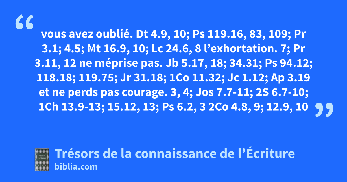 vous avez oublié. Dt 4.9, 10; Ps 119.16, 83, 109; Pr 3.1; 4.5; Mt 16.9, 10; Lc 24.6, 8 l’exhortation. 7; Pr 3.11, 12 ne méprise pas. Jb 5.17, 18; 34.31; Ps 94.12; 118.18; 119.75; Jr 31.18; 1Co 11.32; Jc 1.12; Ap 3.19 et ne perds pas courage. 3, 4; Jos 7.7-11; 2S 6.7-10; 1Ch 13.9-13; 15.12, 13; Ps 6.2, 3 2Co 4.8, 9; 12.9, 10