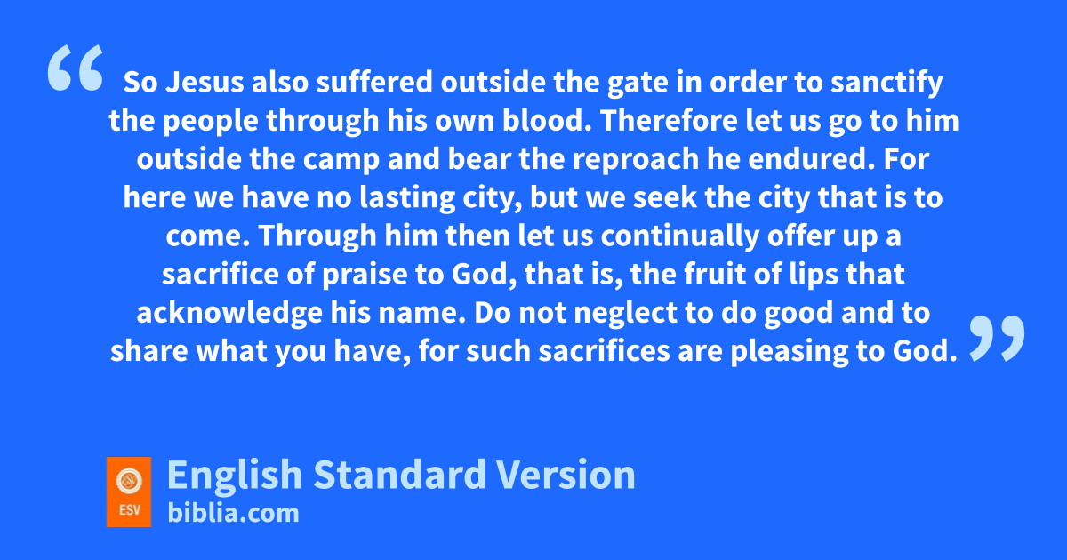 7 Remember fyour leaders, those who spoke to you the word of God. Consider the outcome of their way of life, and gimitate their faith. 8 Jesus Christ is hthe same yesterday and today and forever. 9 Do not be iled away by diverse and strange teachings, for it is good for the heart to be strengthened by grace, jnot by foods, which have not benefited those devoted to them. 10 We have an altar kfrom which those who serve the tent1 have no right to eat. 11 For lthe bodies of those animals whose blood is brought into the holy places by the high priest as a sacrifice for sin are burned moutside the camp. 12 So Jesus also nsuffered ooutside the gate in order to sanctify the people pthrough his own blood. 13 Therefore let us go to him outside the camp and bear qthe reproach he endured. 14 For rhere we have no lasting city, but we seek the city that is to come. 15 sThrough him then let us continually offer up ta sacrifice of praise to God, that is, uthe fruit of lips that acknowledge his name. 16 Do not neglect to do good and vto share what you have, for such wsacrifices are pleasing to God.