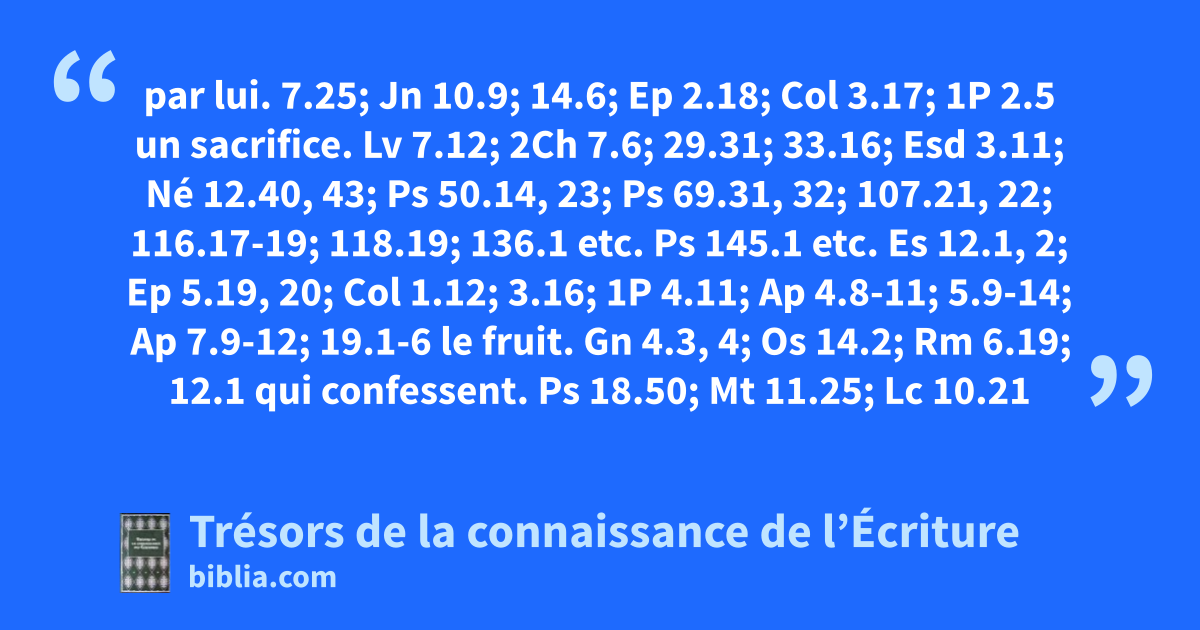 par lui. 7.25; Jn 10.9; 14.6; Ep 2.18; Col 3.17; 1P 2.5 un sacrifice. Lv 7.12; 2Ch 7.6; 29.31; 33.16; Esd 3.11; Né 12.40, 43; Ps 50.14, 23; Ps 69.31, 32; 107.21, 22; 116.17-19; 118.19; 136.1 etc. Ps 145.1 etc. Es 12.1, 2; Ep 5.19, 20; Col 1.12; 3.16; 1P 4.11; Ap 4.8-11; 5.9-14; Ap 7.9-12; 19.1-6 le fruit. Gn 4.3, 4; Os 14.2; Rm 6.19; 12.1 qui confessent. Ps 18.50; Mt 11.25; Lc 10.21