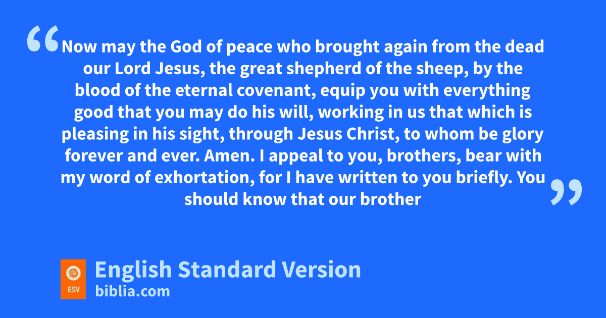 20 Now dmay the God of peace ewho brought again from the dead our Lord Jesus, fthe great shepherd of the sheep, by gthe blood of the eternal covenant, 21 hequip you with everything good that you may do his will, iworking in us2 that which is pleasing in his sight, through Jesus Christ, jto whom be glory forever and ever. Amen.