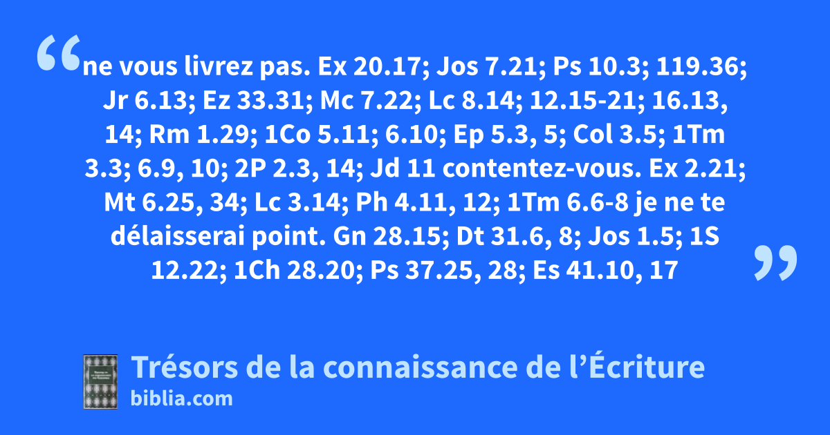 ne vous livrez pas. Ex 20.17; Jos 7.21; Ps 10.3; 119.36; Jr 6.13; Ez 33.31; Mc 7.22; Lc 8.14; 12.15-21; 16.13, 14; Rm 1.29; 1Co 5.11; 6.10; Ep 5.3, 5; Col 3.5; 1Tm 3.3; 6.9, 10; 2P 2.3, 14; Jd 11 contentez-vous. Ex 2.21; Mt 6.25, 34; Lc 3.14; Ph 4.11, 12; 1Tm 6.6-8 je ne te délaisserai point. Gn 28.15; Dt 31.6, 8; Jos 1.5; 1S 12.22; 1Ch 28.20; Ps 37.25, 28; Es 41.10, 17
